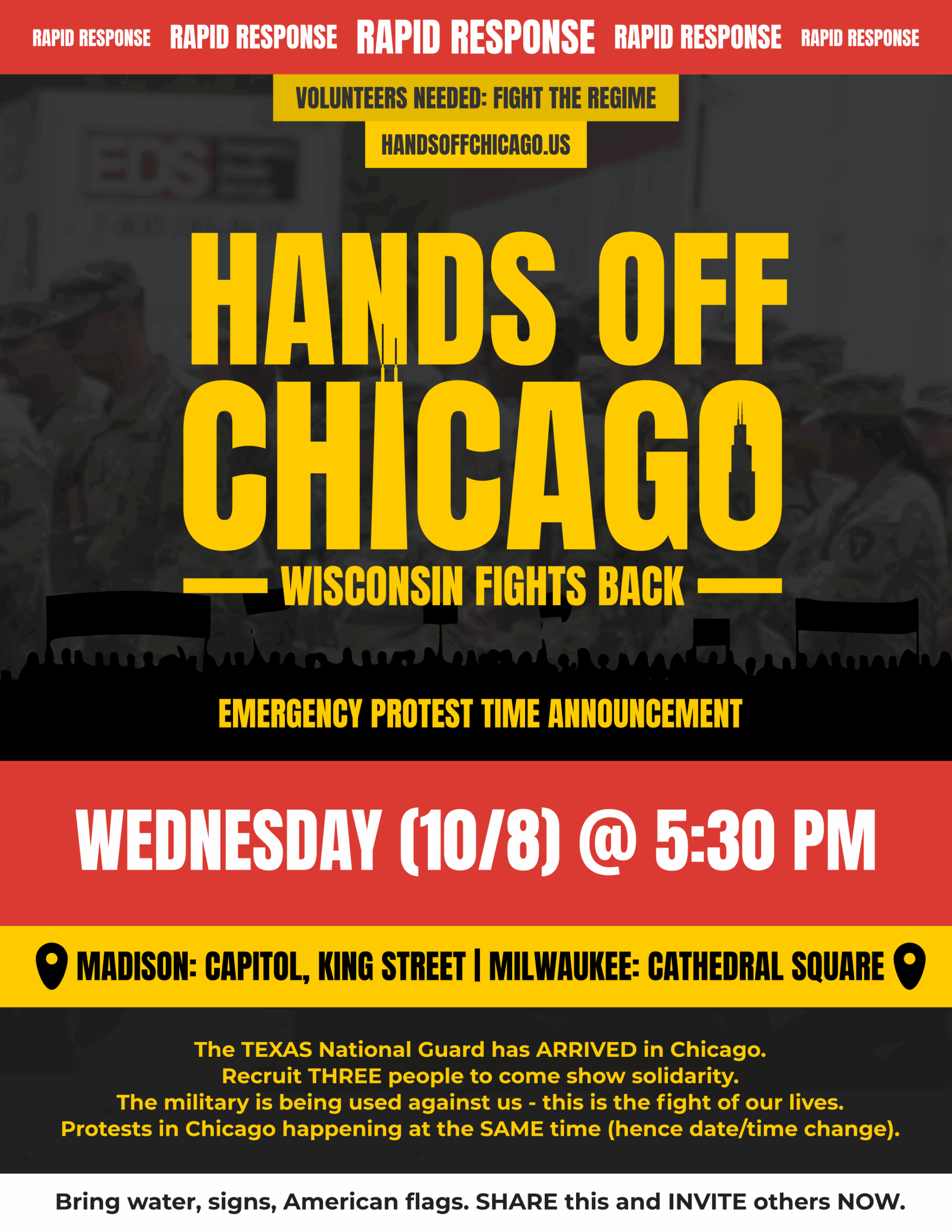 Hands Off Chicago demonstrations in Madison and Milwaukee have been CALLED. They will happen on WED, OCT 8 @ 5:30 PM. Date/Time change to coincide with CHICAGO protests.